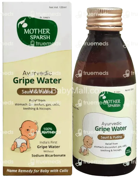 Description: Mother Sparsh Ayurvedic Gripe Water with Saunf & Pudina (120ml) is a 100% Ayurvedic formulation designed to provide relief from common infant digestive issues such as gas, colic, teething discomfort, and hiccups. This gripe water combines the soothing properties of fennel (saunf), mint (pudina), dill (sowa), and carom seeds (ajwain) to promote healthy digestion. It is free from sodium bicarbonate, sugar, alcohol, artificial colors, and flavors, ensuring a safe and natural remedy for babies. Suitable for infants from birth onwards, it offers a gentle solution to ease tummy troubles.\r\n