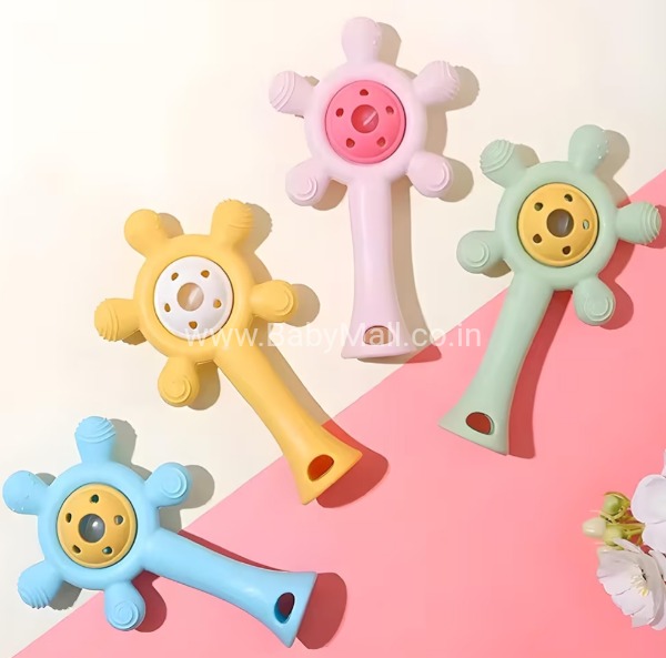 Description: Soft and comfortable silicone baby teether, easy-grip design perfect for tiny hands, built-in rattle to keep babies engaged, made from BPA-free and food-grade silicone, gentle on gums and ideal for teething relief, lightweight and safe for infants, comes with hygienic storage box, promotes sensory development, durable and easy to clean